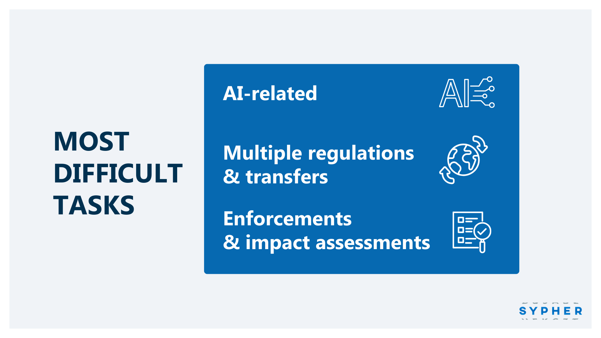 Compliance with the EU AI Act is rated as the most difficult task overall, followed by managing data protection across multiple countries, third-country transfers, data retention enforcement, and DPIAs. These areas combine regulatory complexity with practical implementation challenges.