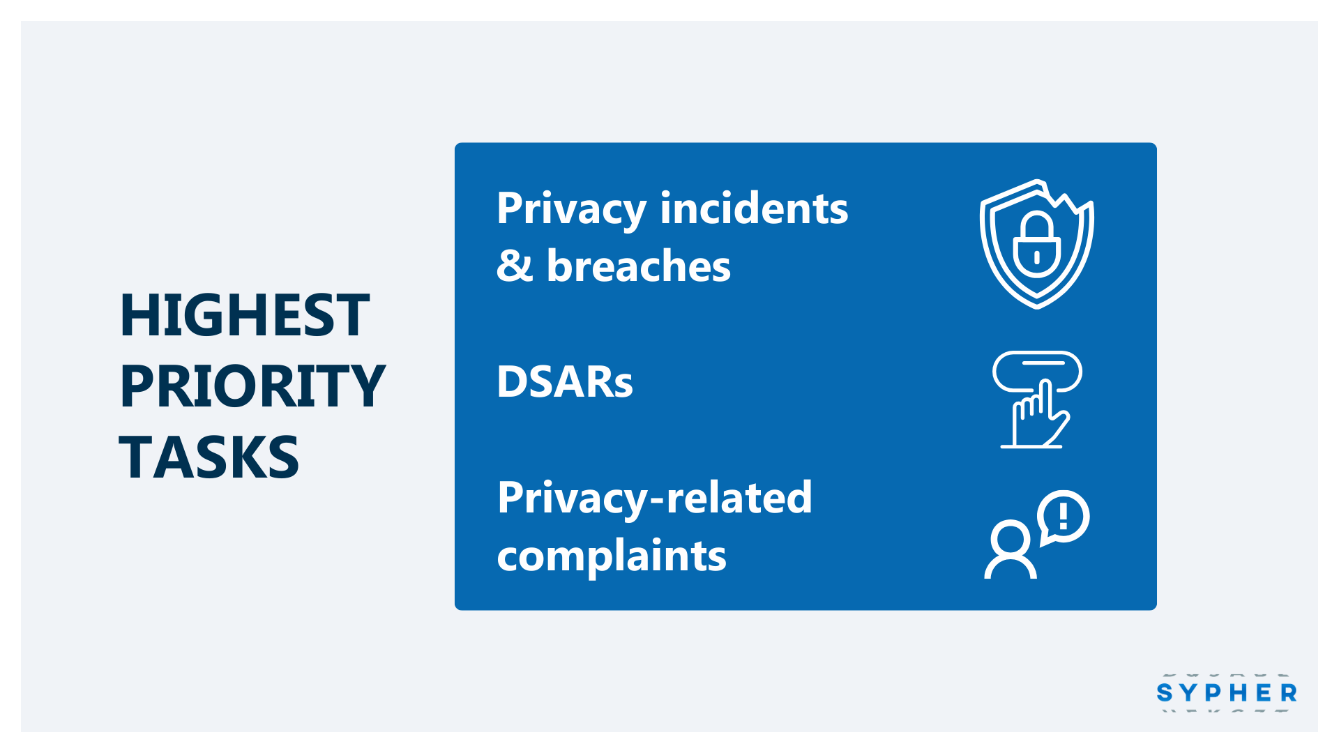 Managing privacy incidents and data breaches remains the highest-priority task, closely followed by DSARs, complaints handling, and advisory support. Priority scores are consistently high across all activities, highlighting an environment where many critical tasks compete for attention at the same time.