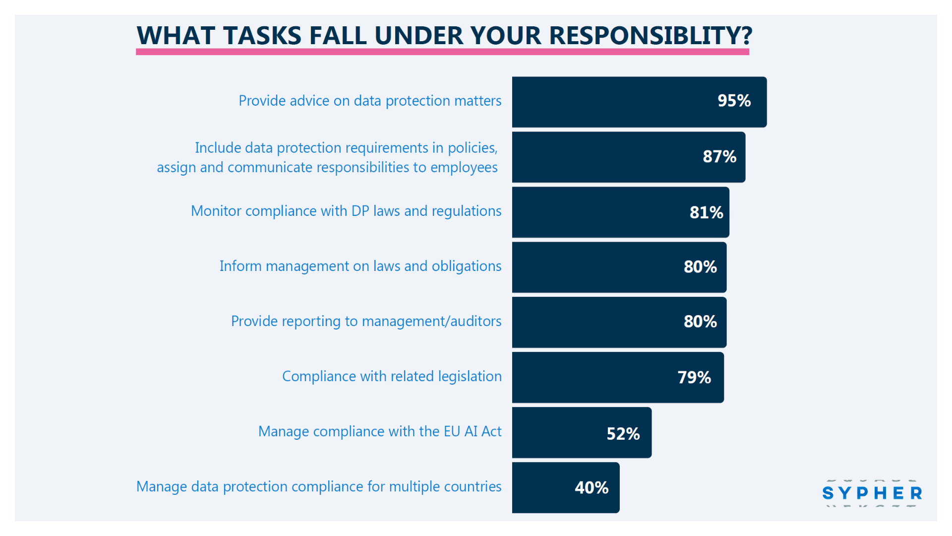 Advisory and governance activities sit at the core of the role, with almost all respondents responsible for providing guidance, embedding data protection into organisational policies, and monitoring compliance. Alongside this, operational work such as privacy notices, training, DPIAs, incident handling, and DSARs continues to absorb significant time and attention.